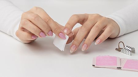 Remove nail forms by squeezing the metal pieces together until they pop away from the nail and wipe away any residue with a cleanser.