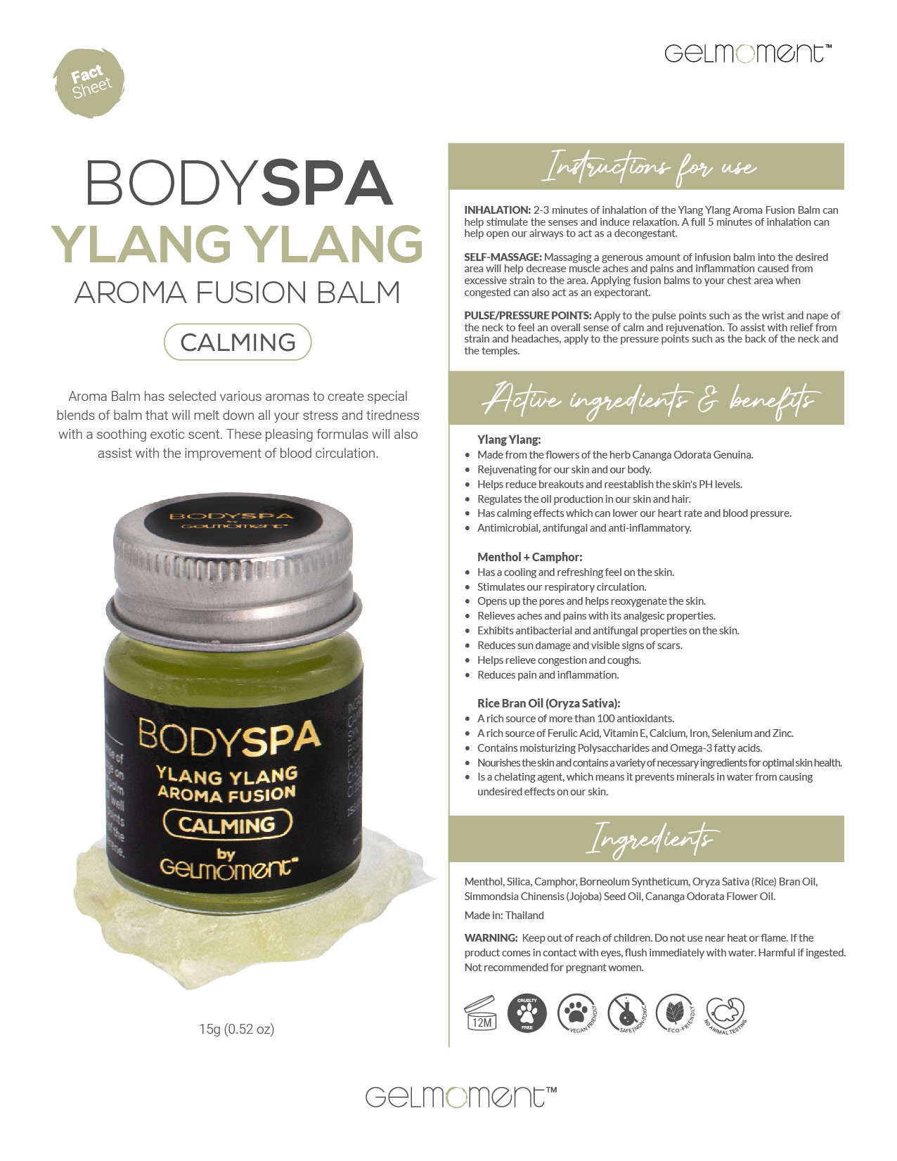 Ylang Ylang Aroma Balm has selected various aromas to create special blends of balm that will melt down all your stress and tiredness with a soothing exotic scent. These pleasing formulas will also help improve your blood circulation.