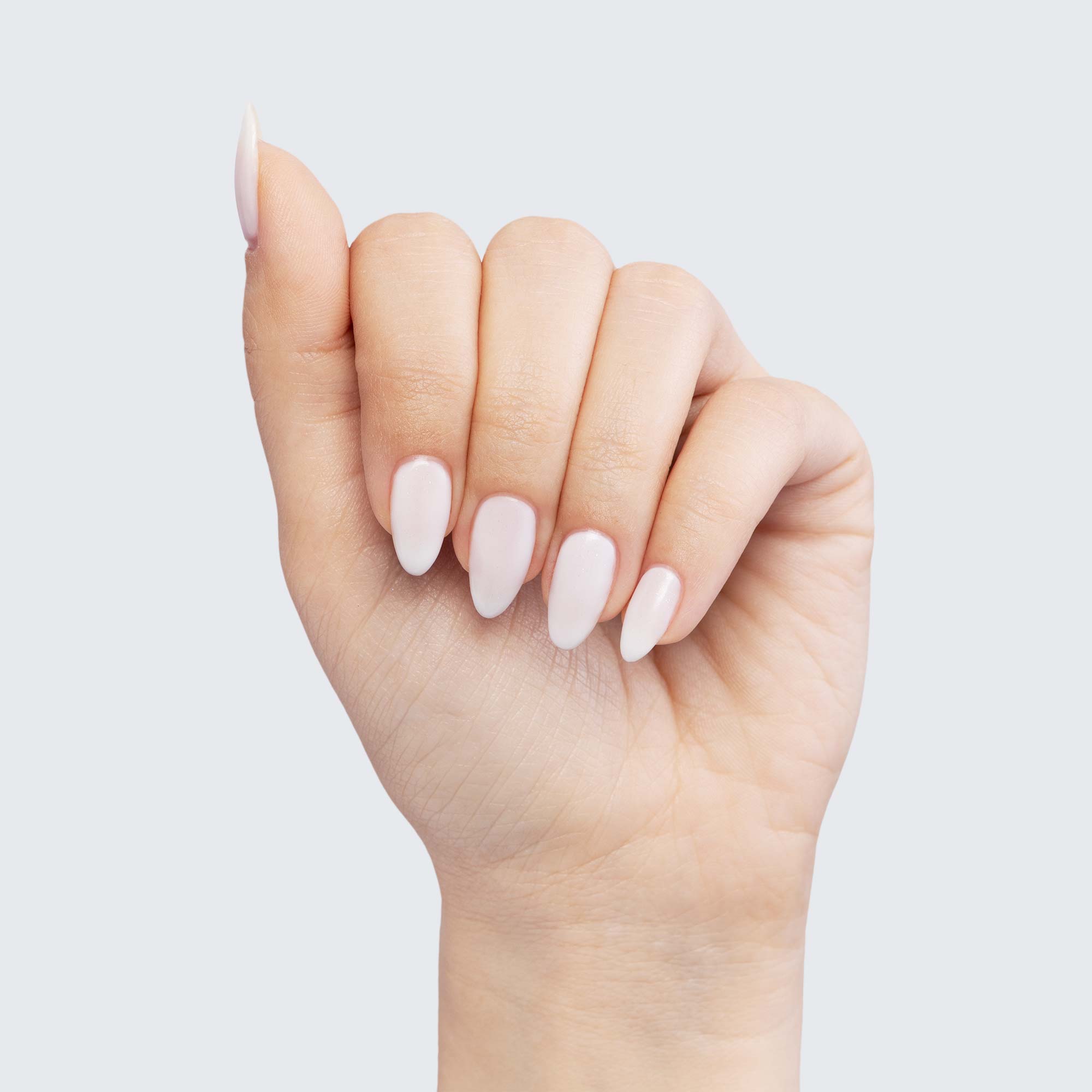 Pearly white with shimmer. Semi-sheer. Semi-matte finish. Neutral undertone.