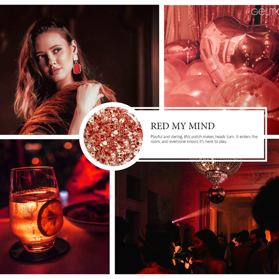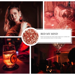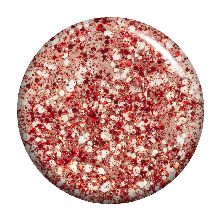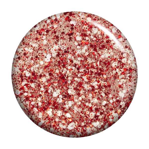 Translucent. Red sparkle, white confetti. Warm undertone.